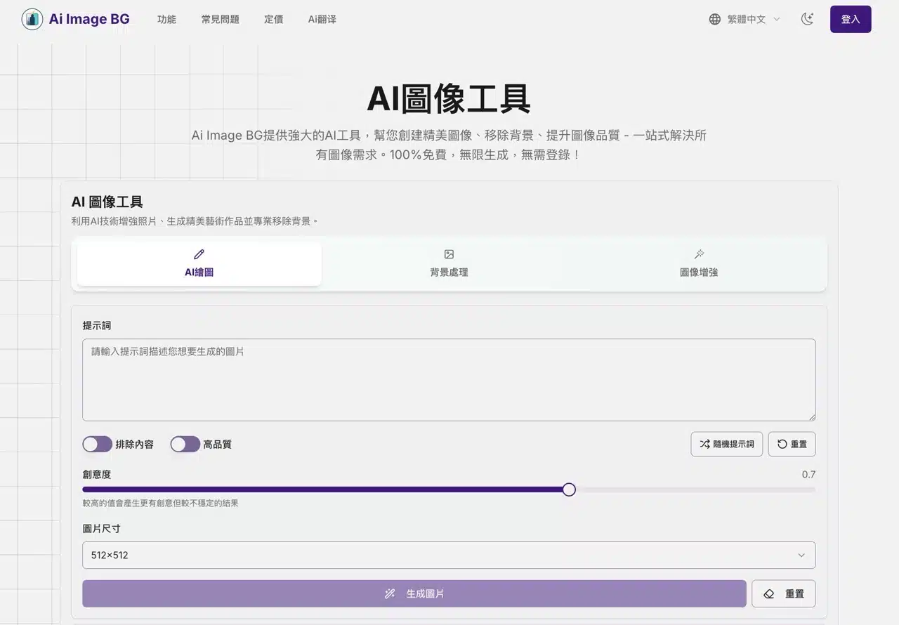 Open the Ai Image BG website and select the AI Image Tool function. AI Image Generation will create images based on the prompts you input. This service supports Chinese prompts. The “Exclude Content” and “High Quality” options below are enabled by default. Adjust the “Creativity” value (default 0.7). Higher values produce more creative results (though they may be less stable).![]()