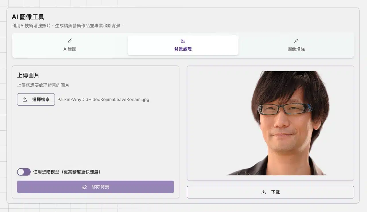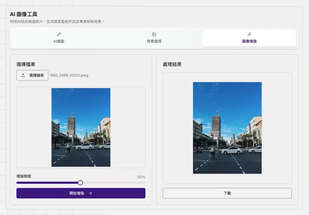 The background processing tool corresponds to the auto-background removal feature. Upload an image to use AI to remove the background and convert it to transparent. This functionality is available on many services; refer to the article “Online Background Removal Tools: 39 Free Online Tools Recommended with Tutorials.” The image enhancement tool improves image quality, repairs blurry images, and enhances details. Try it to make your images more appealing.