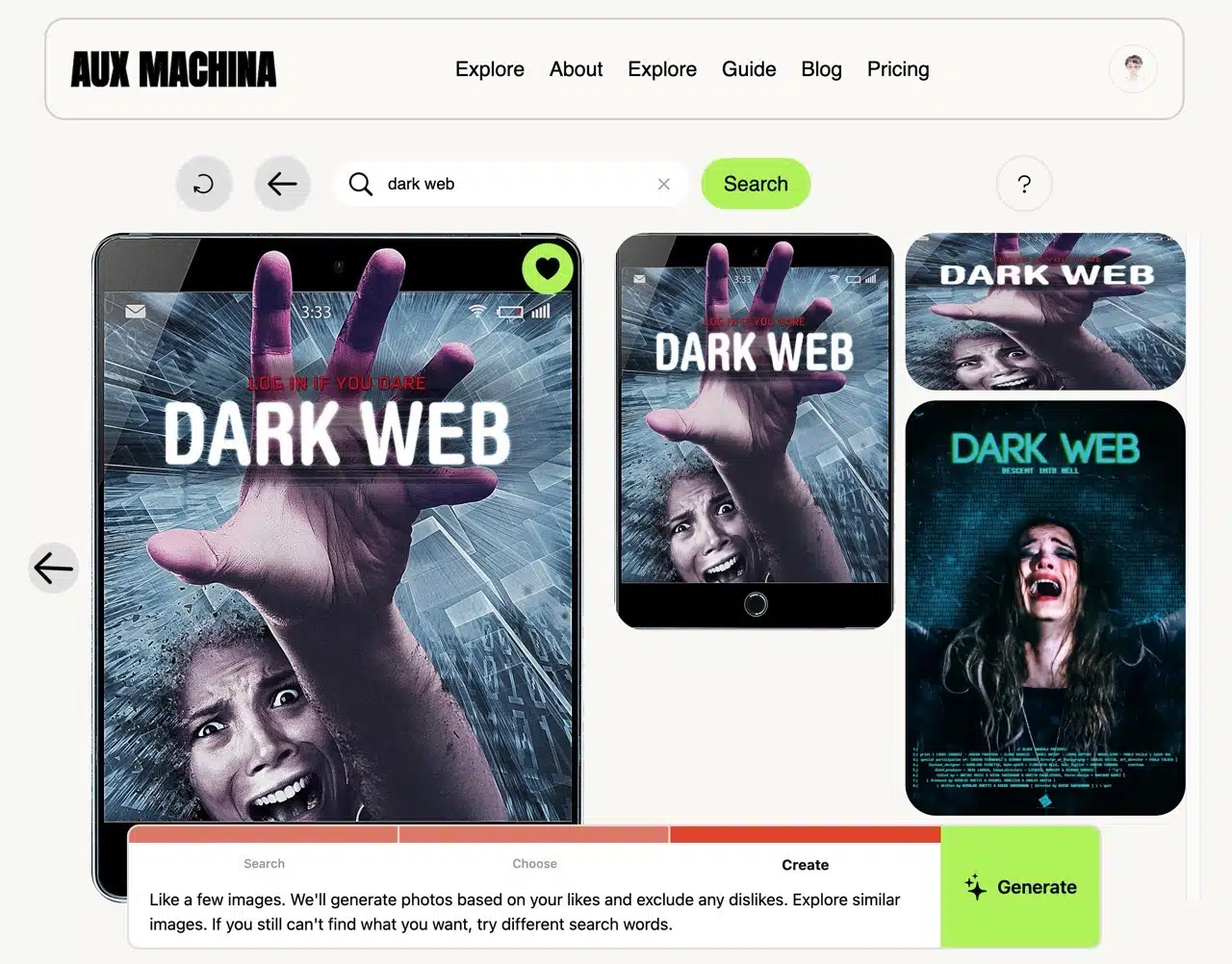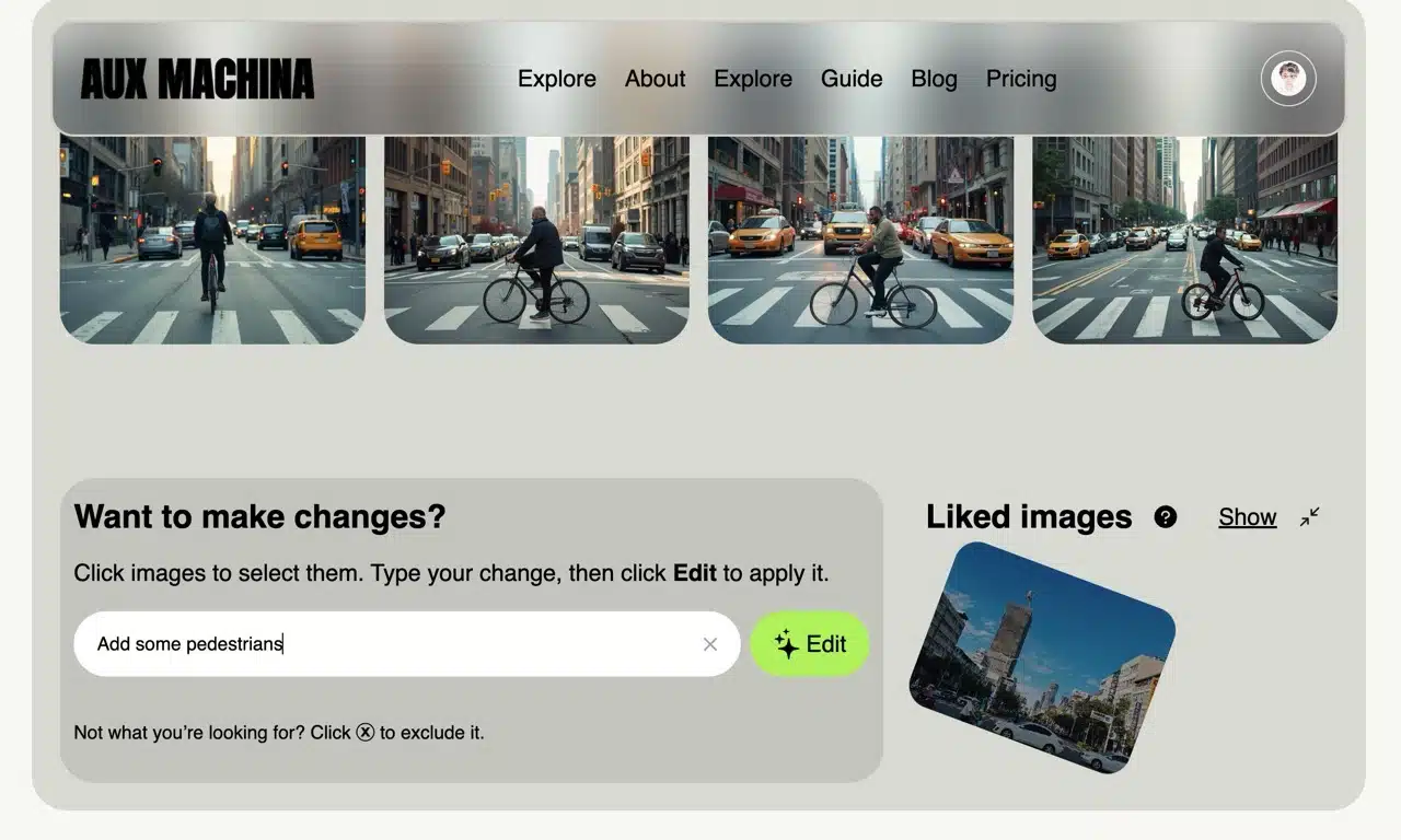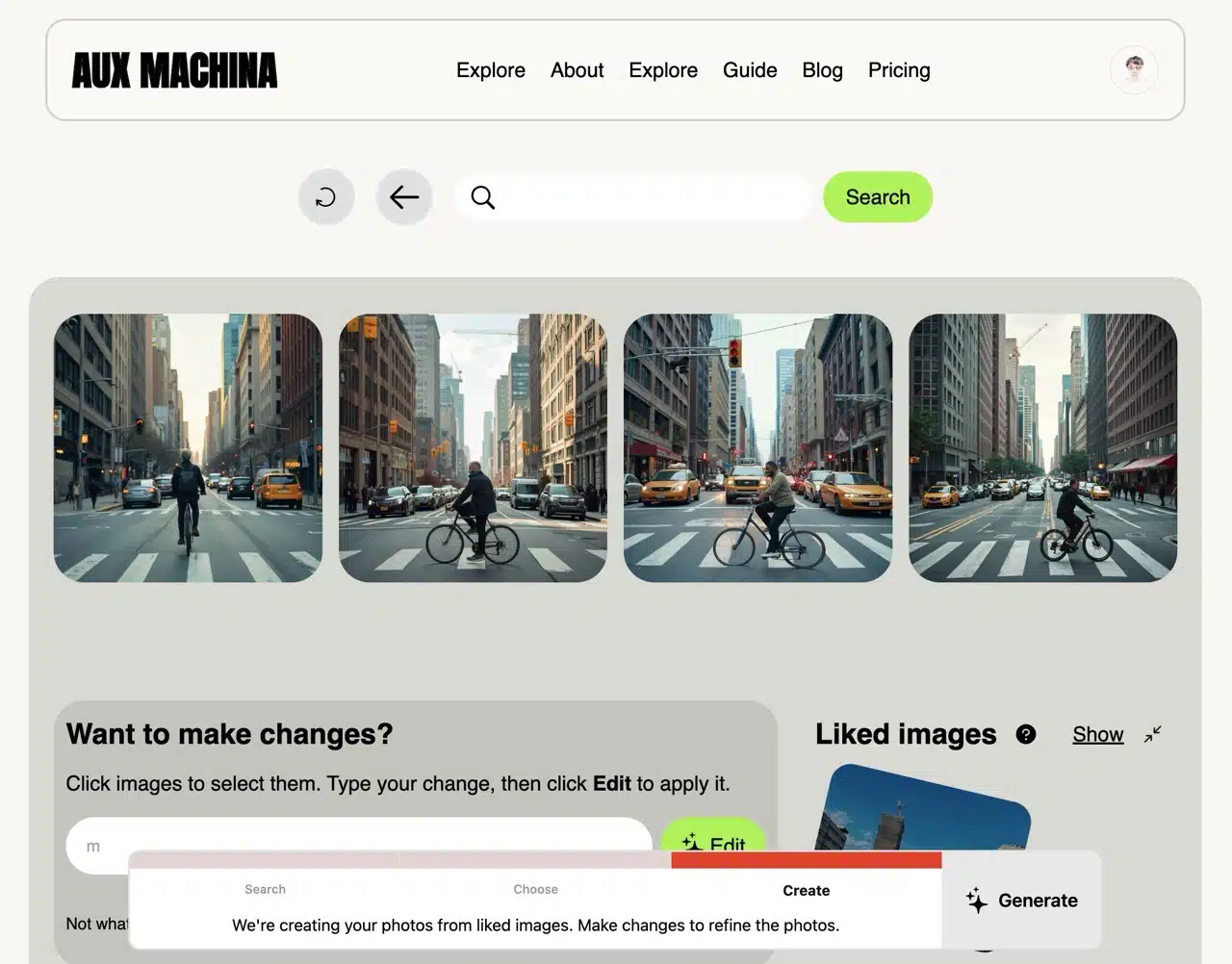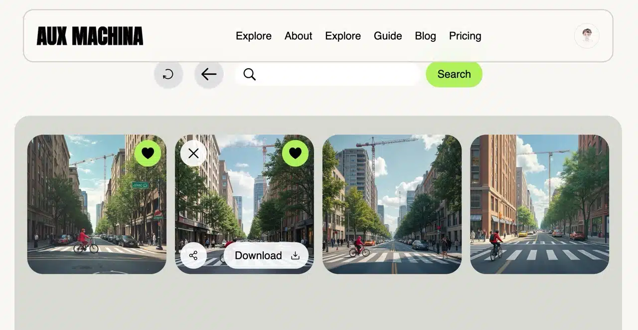 Aux Machina streamlines this process by allowing direct image uploads to quickly generate four similar yet distinct results. Additionally, it enables keyword searches for images online, which can then be imported into Aux Machina to generate analogous visuals.