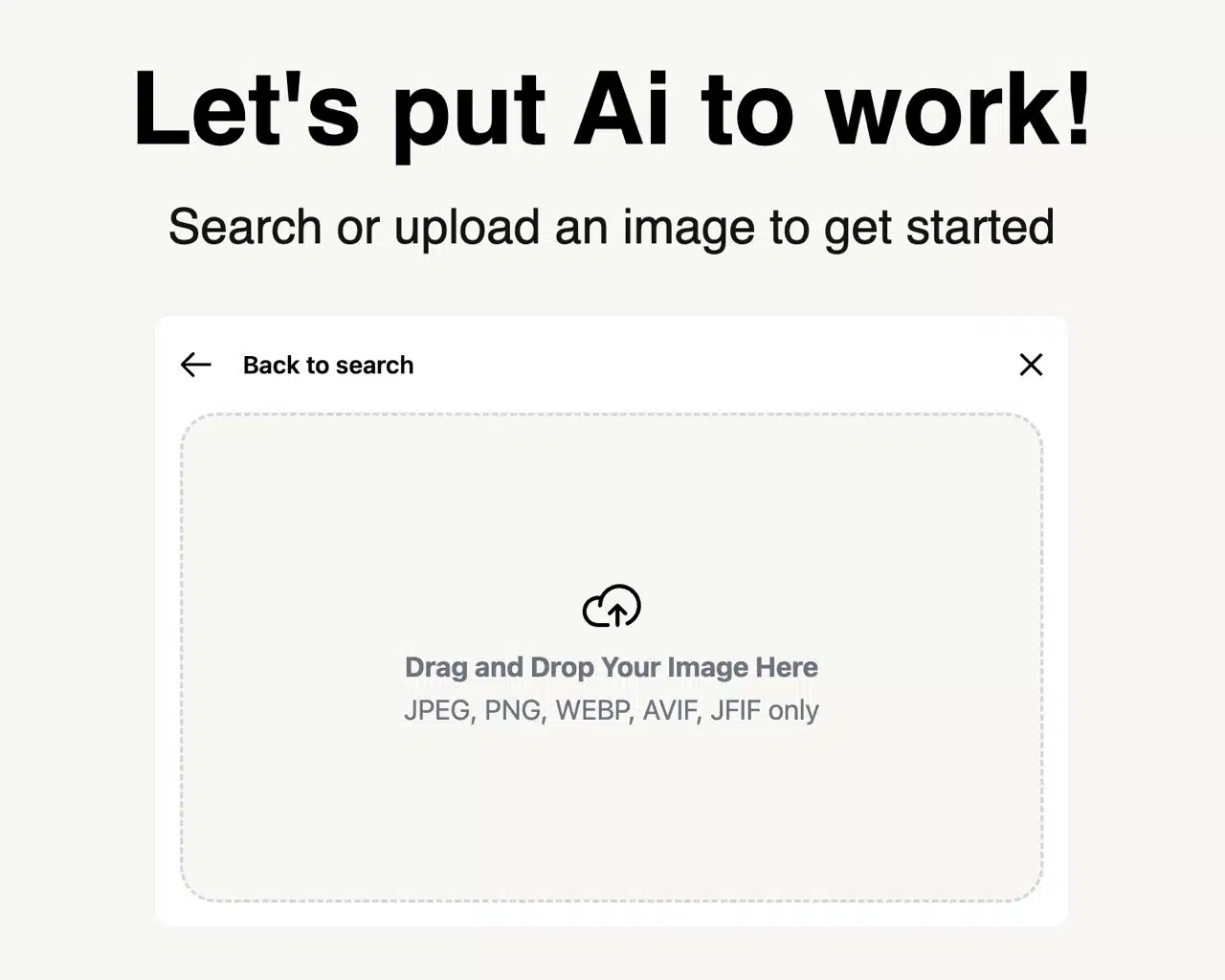 The alternative “image-to-image” method involves clicking the ‘camera’ icon to the right of the search field. This opens a drag-and-drop image upload feature supporting five formats: JPEG, PNG, WEBP, AVIF, and JFIF.