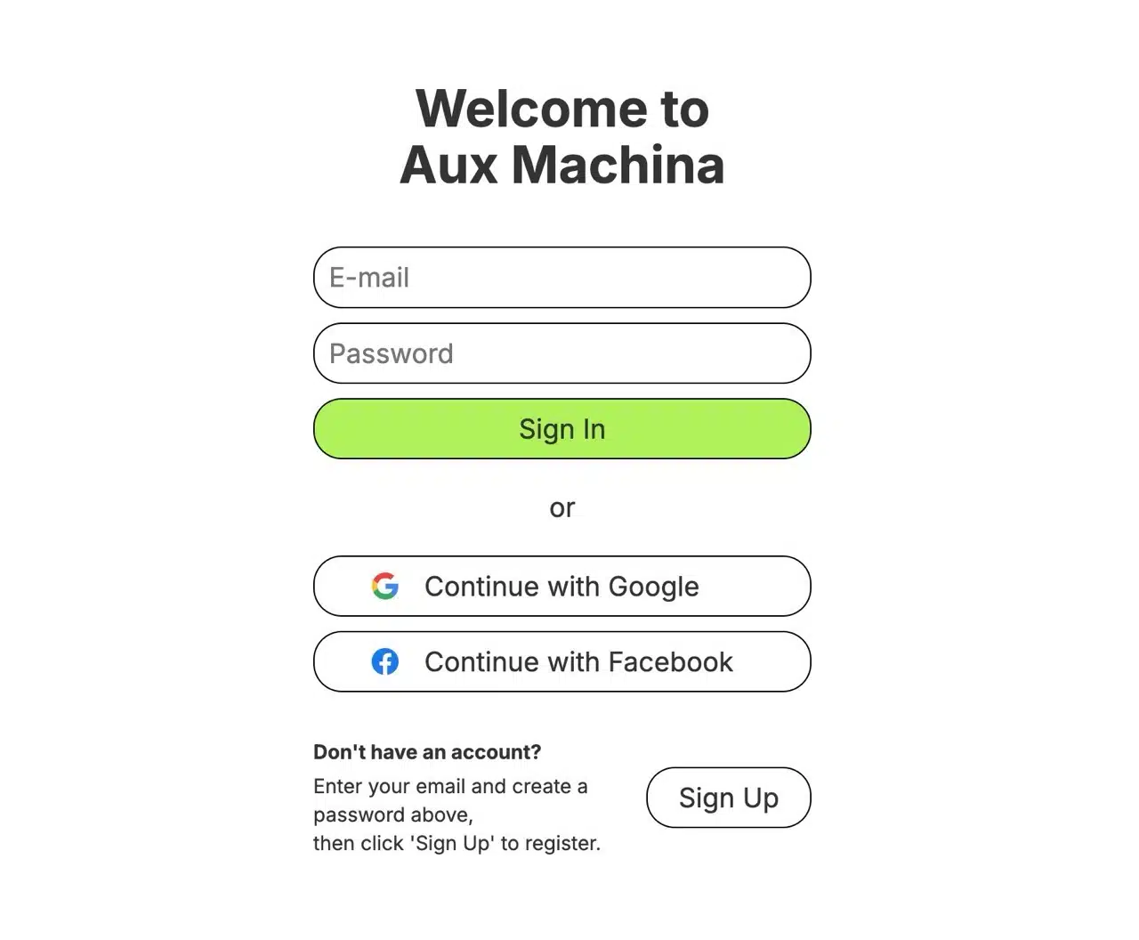 After opening the Aux Machina website, click “Try for Free” in the top-right corner. You'll then see the registration/login page. We recommend signing up or logging in directly using your Google or Facebook account—no verification required.