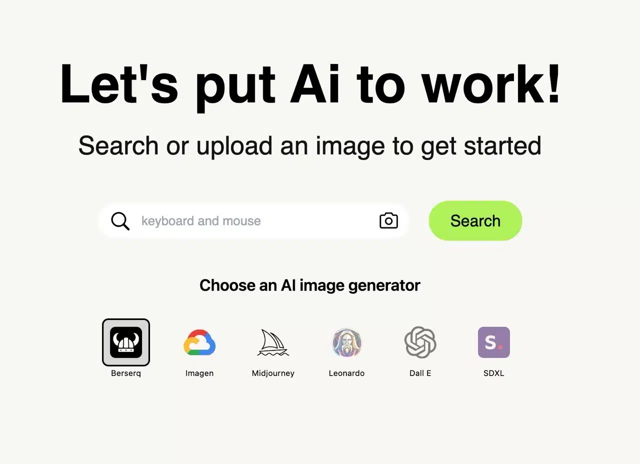 After logging in, you'll see the AI image generator. First, let's cover the basic method: directly enter keywords to search for images online (a list of AI image generator services appears below, but the free plan only allows using Berserq—other services are unavailable).