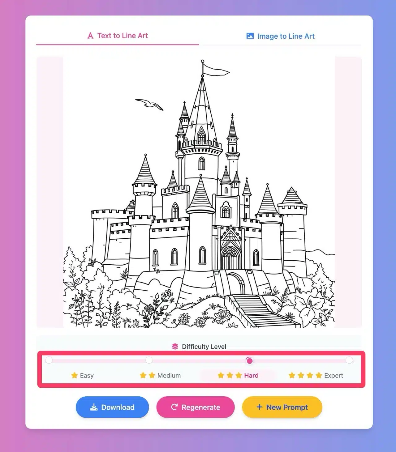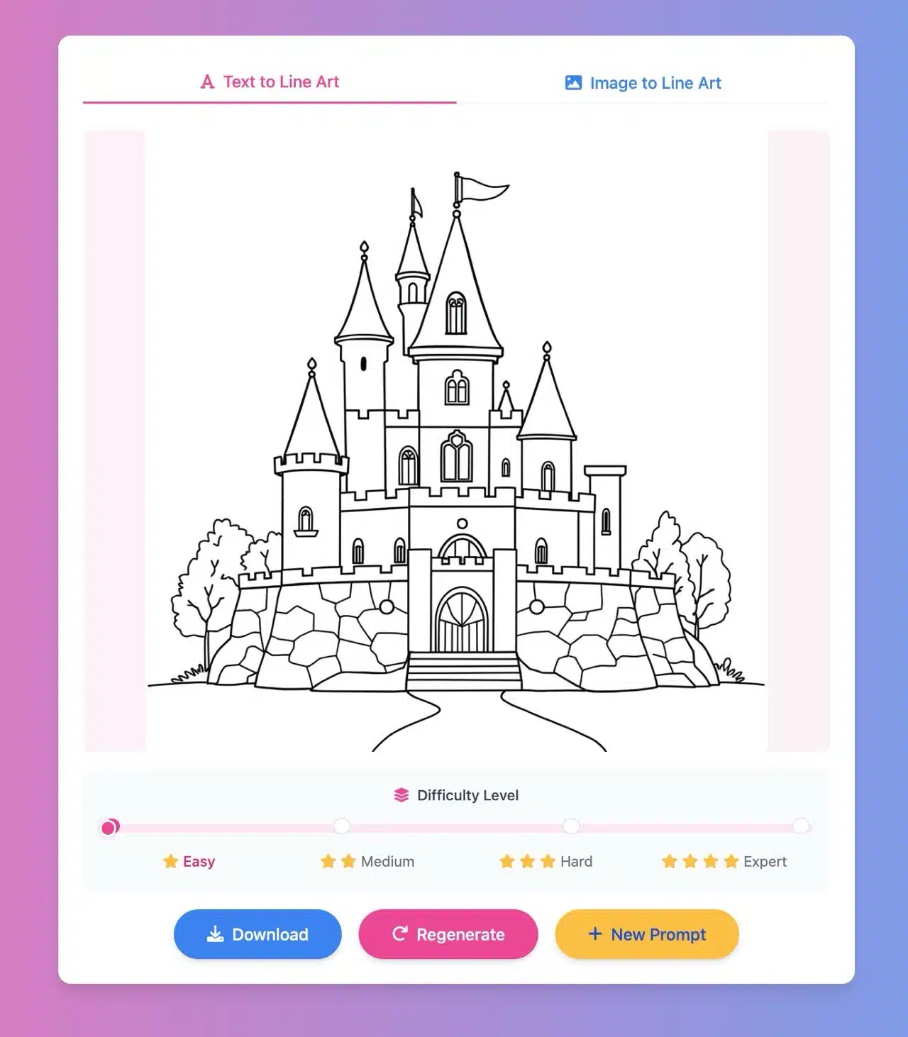 LineArt App also allows you to set the complexity level of the line art, with four options: Easy, Medium, Hard, and Expert. It's suitable for both adults and children. The generated image assets can be downloaded directly for use, edited, or processed further, and can also be used for commercial purposes.