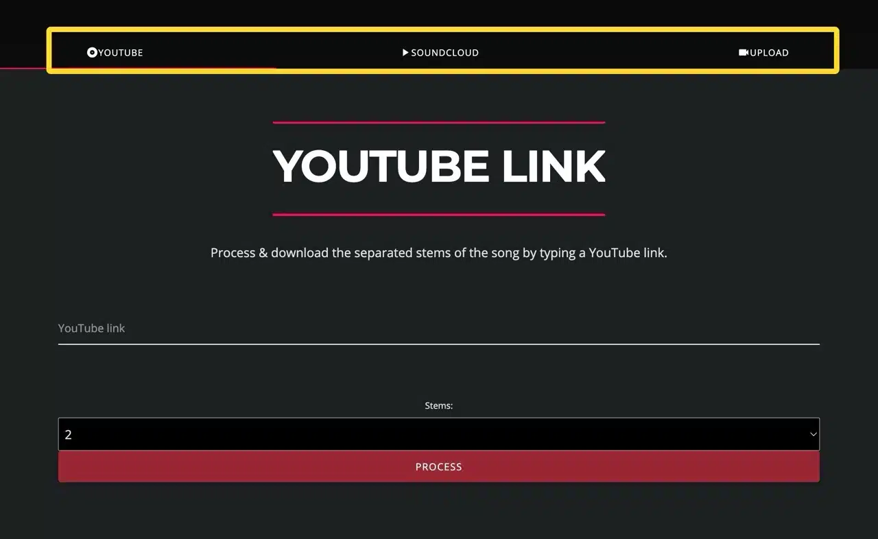 After launching the MazMazika Vocal Removal Tool, first select YouTube, SoundCloud, or manually upload an audio file from the top menu.