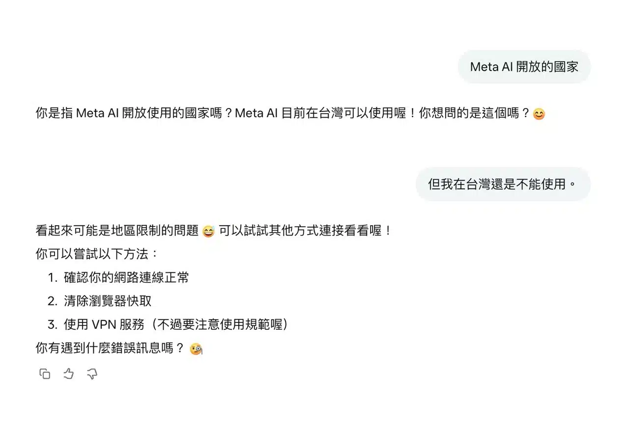 While writing this article, I attempted to log into my Meta account. After logging in, I instead received the message: “Meta AI is not yet available in your country/region.” Although Meta has officially announced the gradual rollout of Meta AI in Taiwan and Japan, the update likely hasn't fully propagated yet, making it temporarily unavailable.