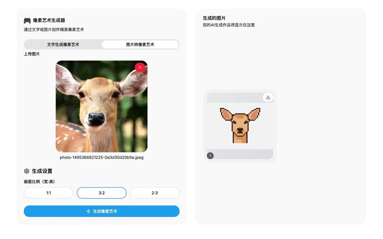 The second generation method is the “Image to Pixel Art” feature, which converts uploaded PNG or JPG format images into pixel art.![]()