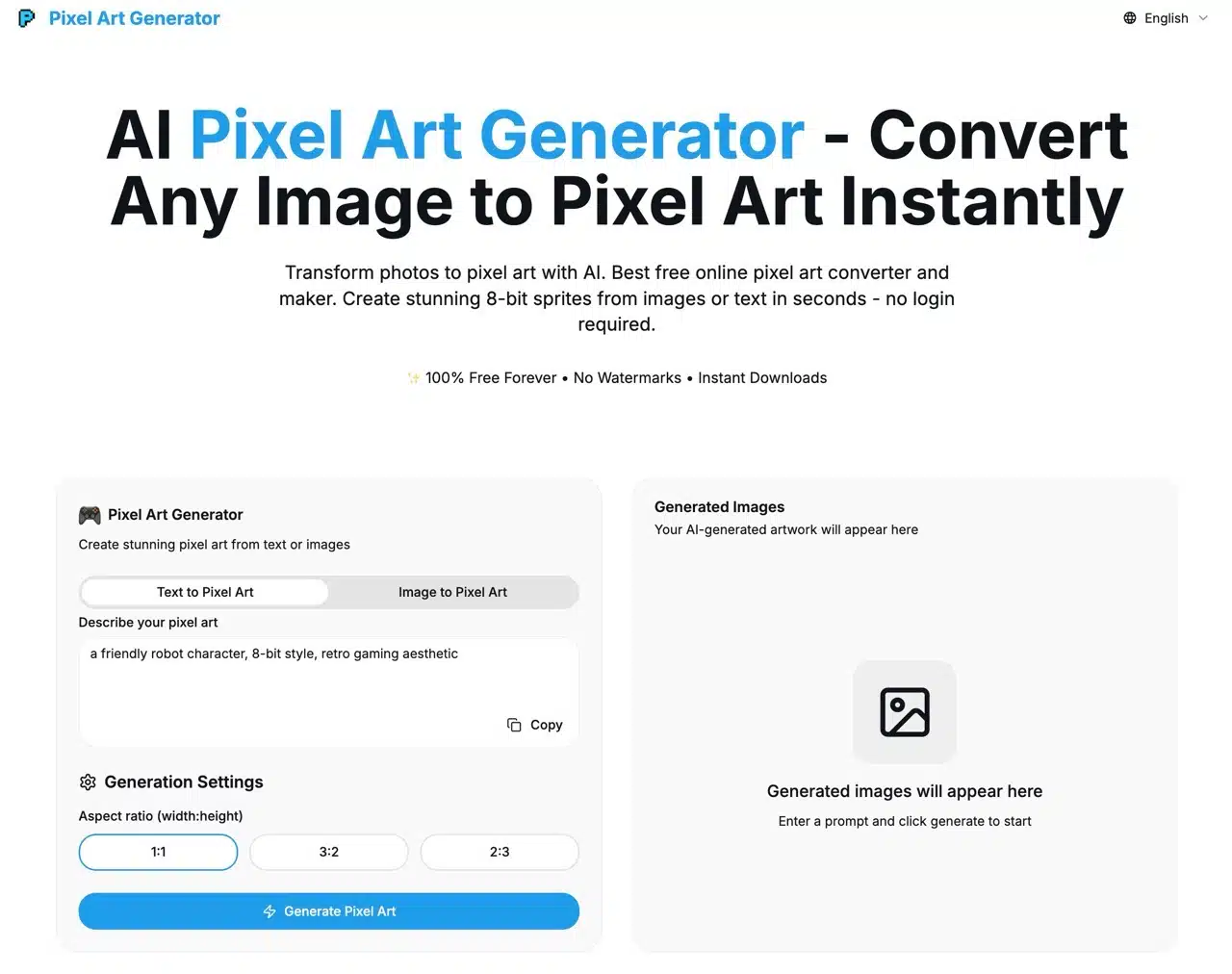 Most common AI image generators utilize prompts—descriptions of desired images entered by users—which the AI then analyzes and processes to create visuals. What sets Pixel Art Generator apart is its image-to-pixel-art conversion feature: simply upload an original image, and it generates a pixel art version, even for complex visuals.