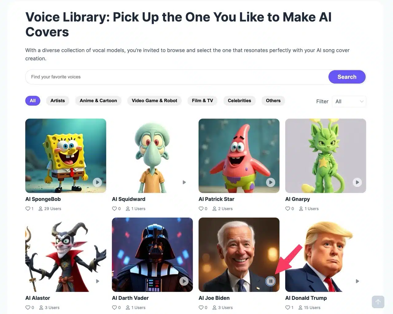 PopPop AI Song Cover offers voices from famous singers, anime/cartoon characters, celebrities, video game characters, and TV series characters. Click the play icon in the bottom right corner of an image to hear a voice preview. It's impressive how AI-generated music can sound remarkably similar.