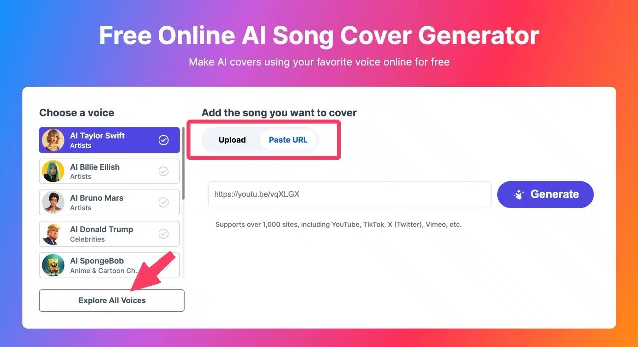 By default, voices of celebrities, politicians, or cartoon characters are available. Click “Explore All Voices” in the bottom-left corner to view the full voice library.