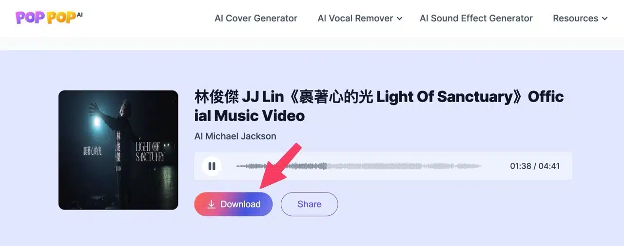 Once finished, preview and play the AI-cover music directly online. You'll be amazed by the powerful AI technology. Click the download button to save the music. Before downloading, a sharing prompt may appear—how could such an awesome service be just for me? Remember to recommend PopPop AI's music cover tool to more friends!