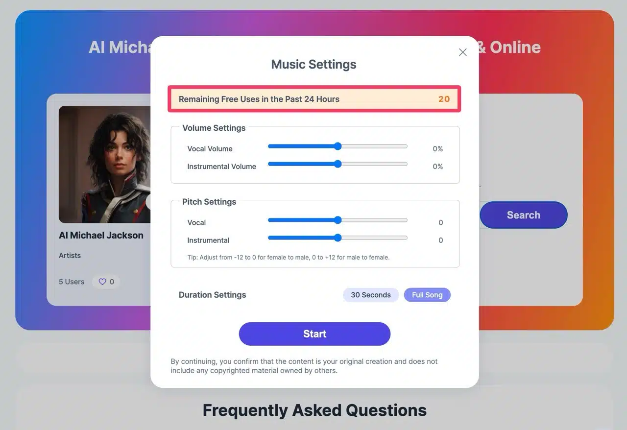 After selecting your song, configure the music settings. A notification bar at the top displays your remaining free daily uses (limited to 20 songs per day). Before starting, adjust volume and pitch settings—tweak overall volume, instrument levels, vocal pitch, and instrument pitch. If no changes are needed, simply keep the default values.