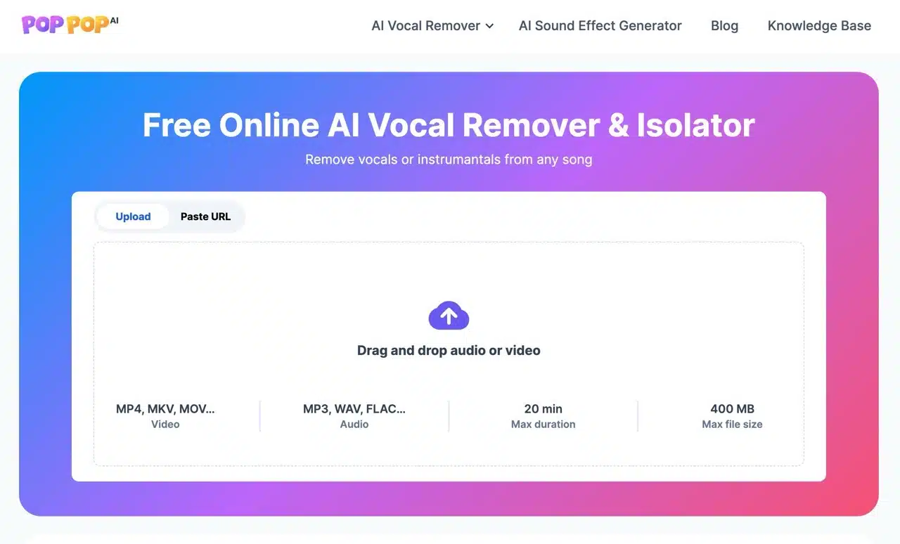 After opening the AI Vocal Remover website, drag and drop your music or video file to upload it. Files must not exceed 400 MB or 20 minutes in length. Processing may take some time after upload.![]()