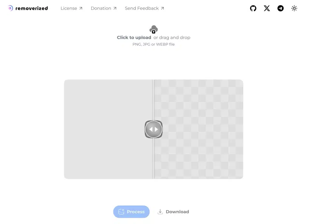 After entering the Removerized website, click “Click to upload” at the top to select the image you want to remove the background from, or simply drag and drop the image file into the upload field (supports PNG, JPG, or WebP formats). Then click “Process” to begin the background removal.