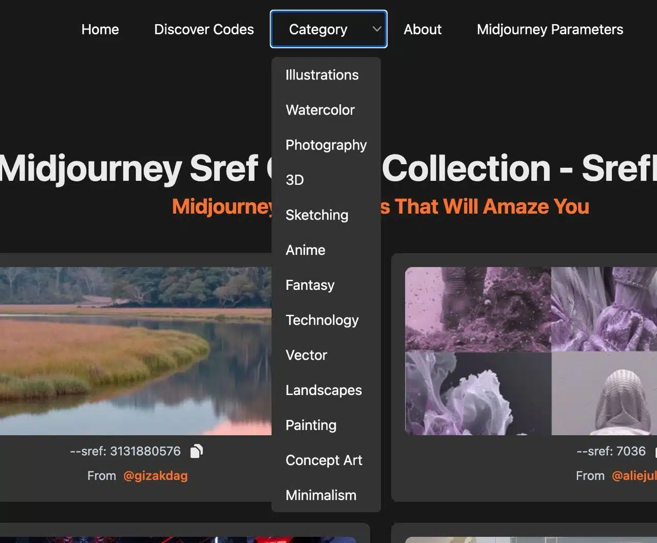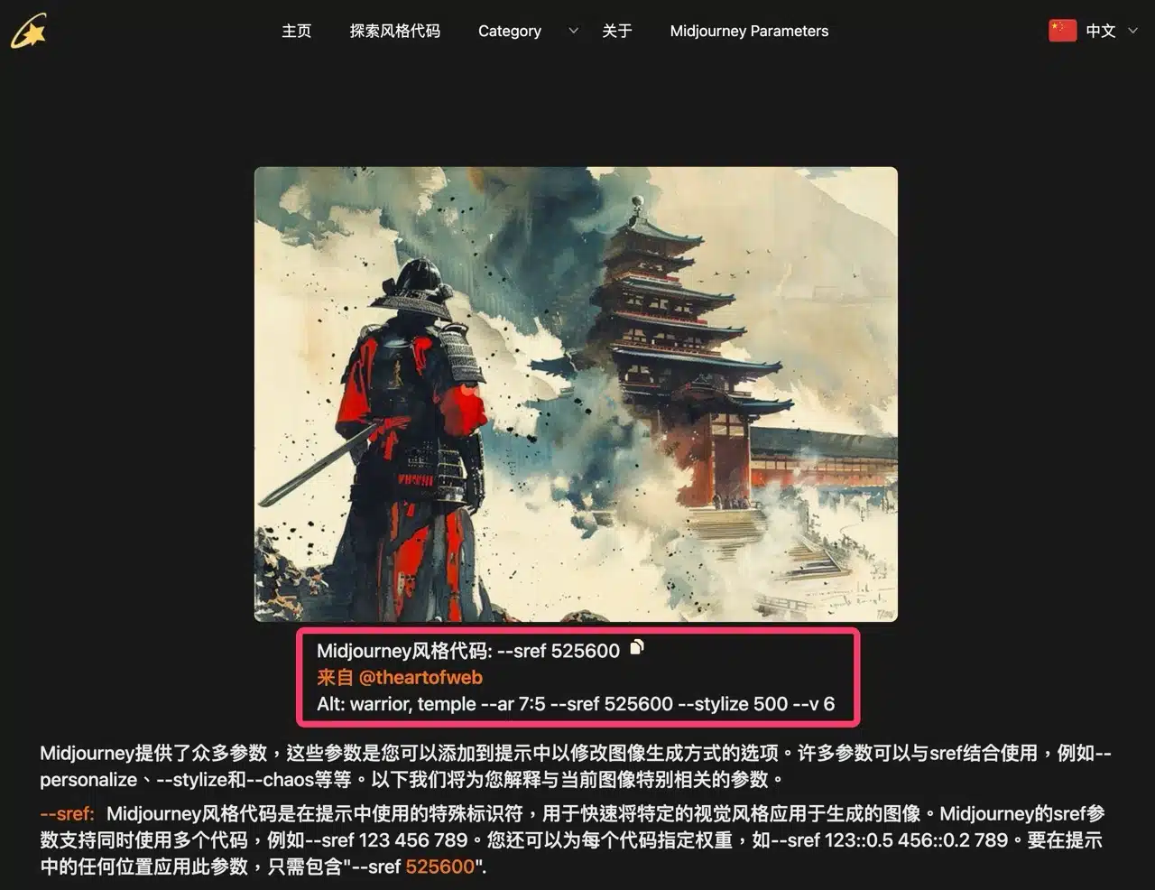 After entering a specific category, SrefHunter will display relevant images. The most crucial style code is the string of randomly generated numbers following “–sref” in the image description.