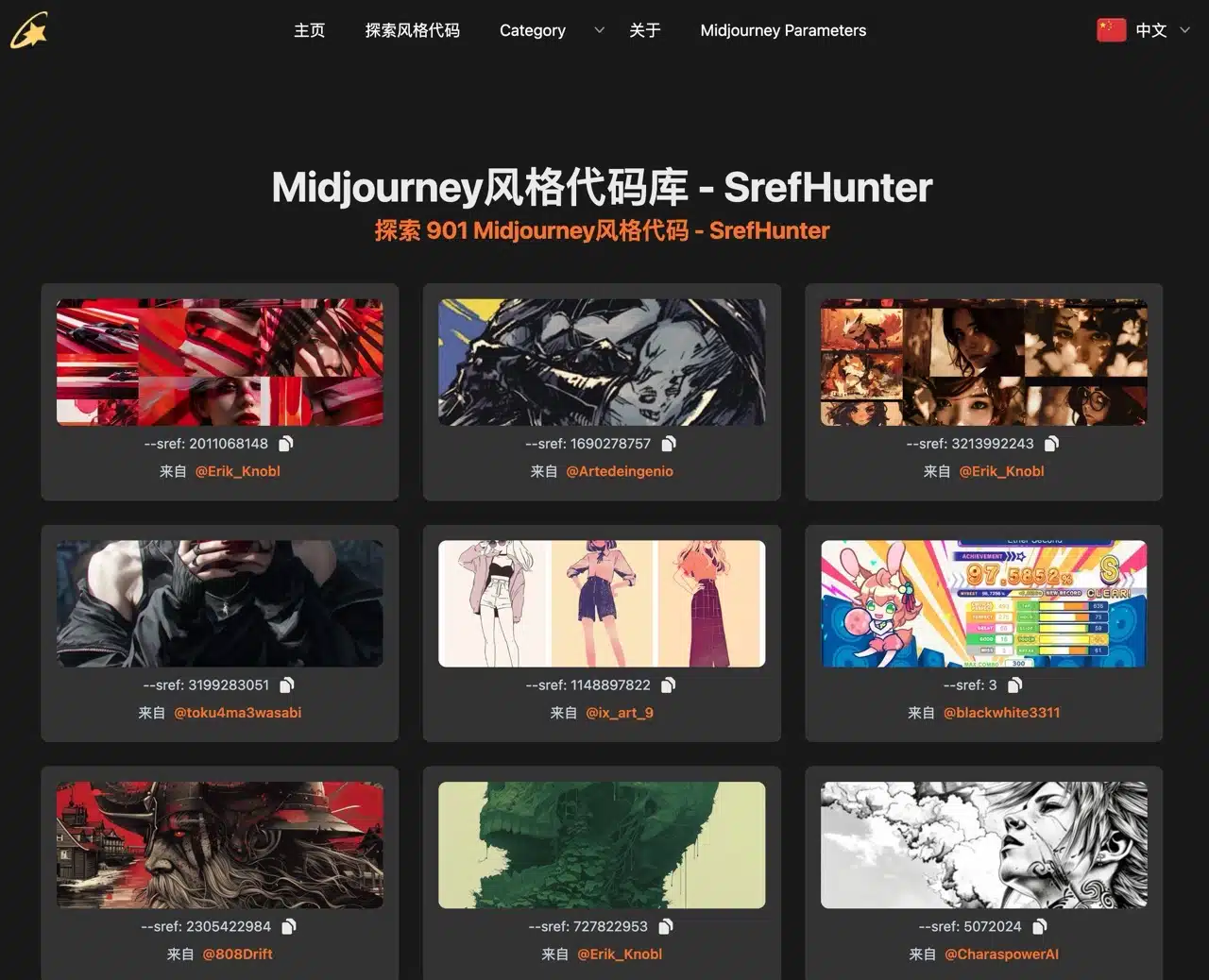 After opening the SrefHunter website, first switch the language to “Chinese” in the top-right corner. The homepage will then display numerous images collected from social media.